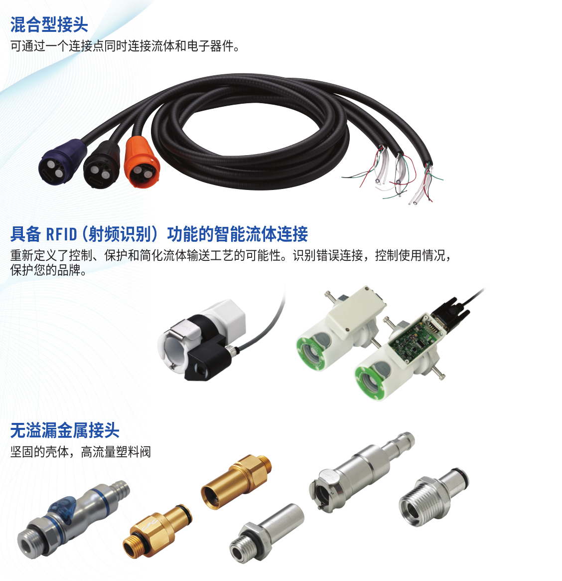 方案 讓流體和空氣連接更方便使用,更可靠,提高產品的模塊化和可維護性,提供更清潔,更快速,更安全,更智能的連接方式,使您的產品增值。如果您無法從我們數以千計的標準產品中找到完美的解決方案,或者您希望擺脫項目的連接器部分,以便專注于核心技術,CPC Engineered Solutions可以提供幫助。